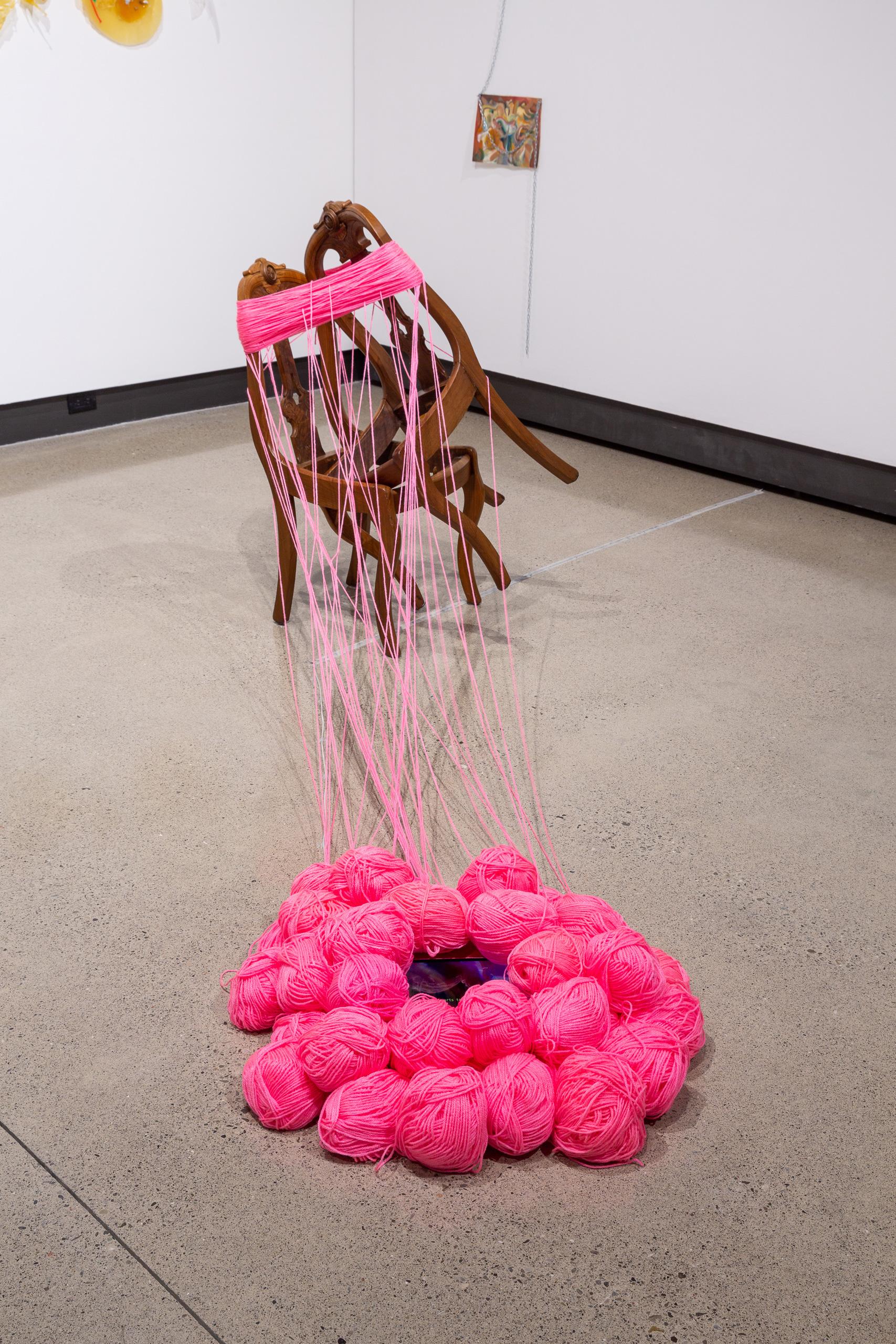 The works in A spill that stays streaming attempt to capture the moment when materials settle into one another, adapting to the often goopy, brittle, destructive or generative processes of matter moving and evolving. Working with the idea of “cooperative materiality”, these sculptures are my experiments with making materials work together to grow with or against their neighbours and surroundings. Using methods of squishing, stretching, spreading or sticking, my goal is to punctuate the life cycles of my materials with a little romance, like how a kid might smush their doll’s heads together to make it look like they’re kissing.